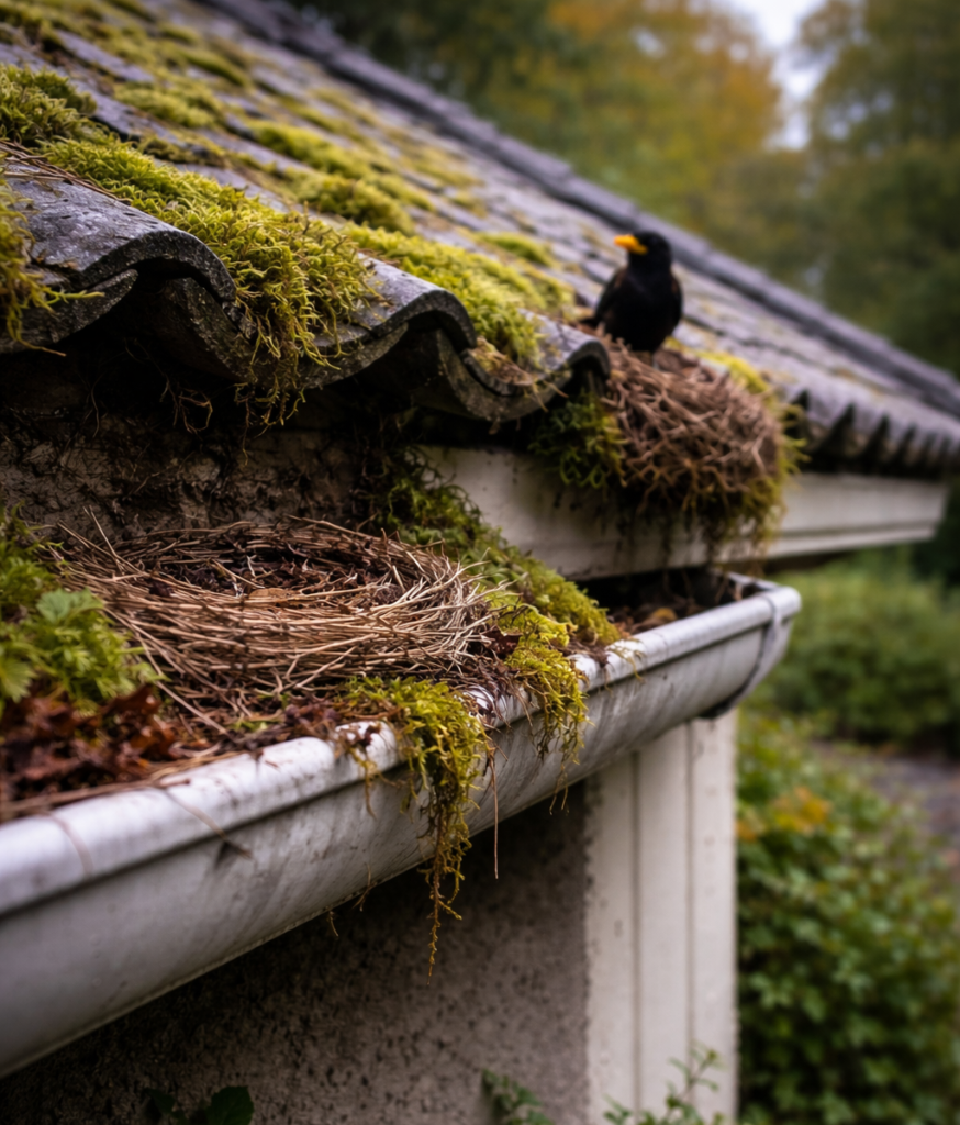Även fåglar bidrar till att hängrännor svämmar över. När de bygger bon på taket använder de kvistar, gräs, mossa och annat material som lätt blåser ner eller trillar ner i rännorna. I kombination med löv och sand skapas snabbt hinder som gör att vattnet inte kan ledas bort på rätt sätt.
